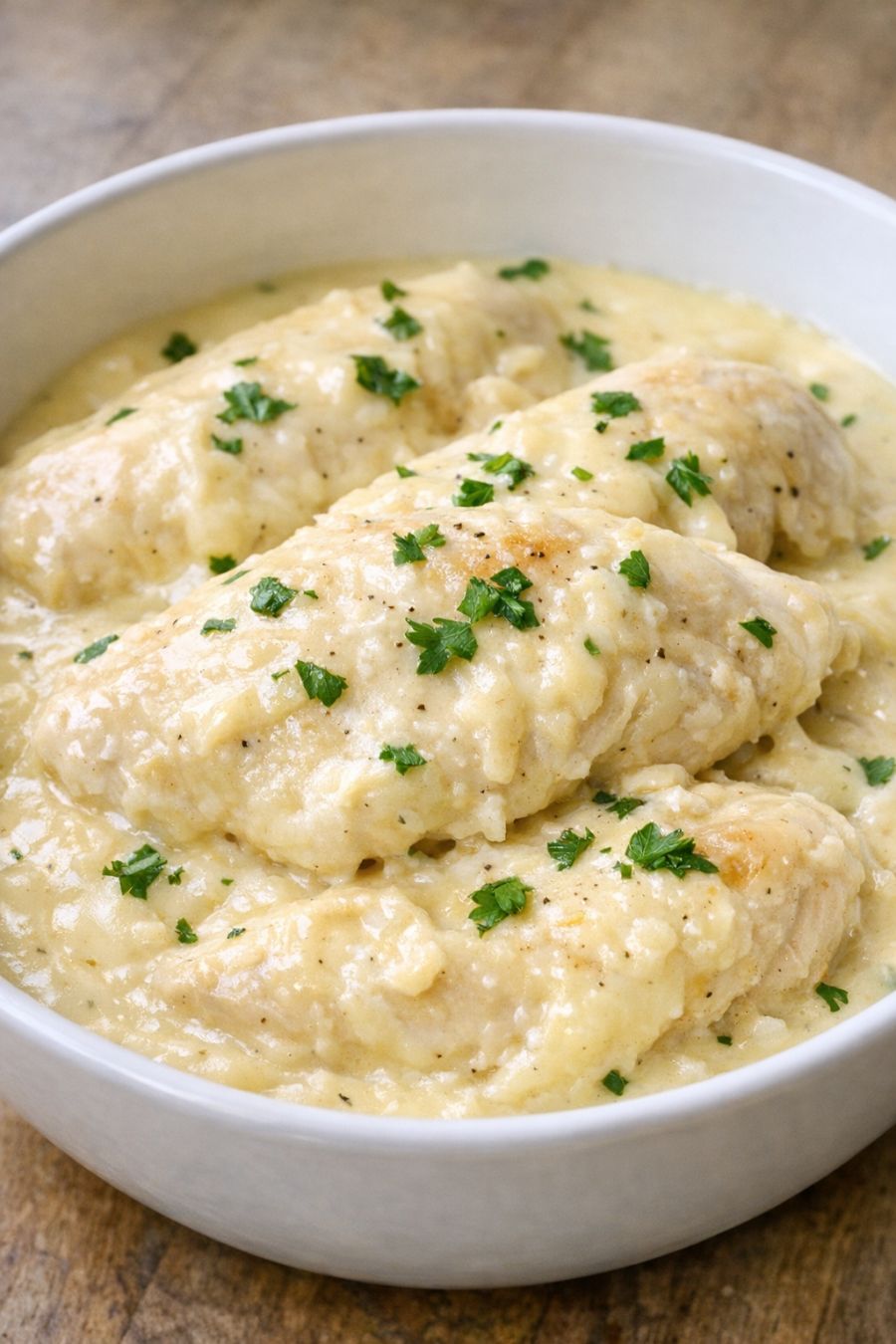 Because this recipe is intentionally minimalist, it’s easy to customize. For a bit more flavor complexity without adding much effort, you can sprinkle in dried herbs—such as thyme, parsley, or Italian seasoning—along with the soup. If you like a more pronounced tang, add a spoonful of ranch seasoning or a splash of buttermilk at the end to brighten the richness. For a slightly lighter version, use reduced-fat cream cheese and a lower-sodium condensed soup; the texture will still be creamy, though a touch less decadent. You can also swap the cream of chicken soup for cream of mushroom or cream of celery to change the flavor profile, or use boneless, skinless chicken thighs if you prefer a richer, more forgiving cut that stays especially moist. To turn this into a more complete one-pot meal, stir in a bag of thawed frozen mixed vegetables or frozen peas during the last 30 minutes of cooking so they warm through without overcooking. Leftovers keep well in the refrigerator for several days and reheat nicely on the stovetop or in the microwave; if the sauce thickens too much, simply loosen it with a splash of broth or water while reheating.