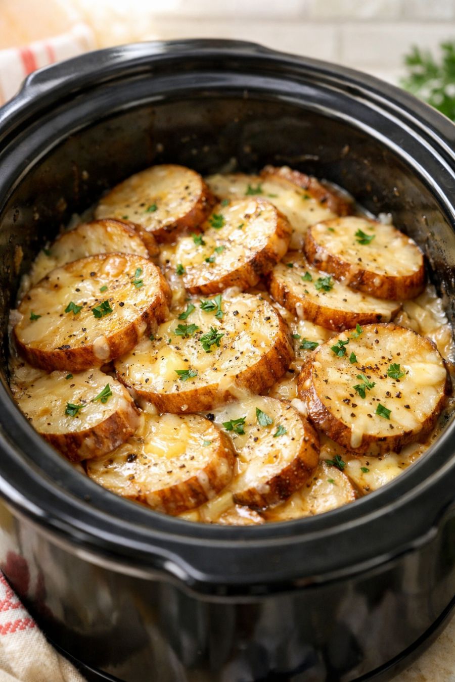 Cover the slow cooker with the lid and cook on HIGH for 3 to 4 hours, or on LOW for 6 to 7 hours, until the potatoes are very tender when pierced with a fork and the cream and butter have thickened into a rich, glossy sauce.