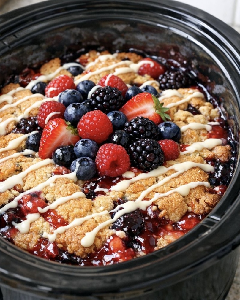 Serve this warm, scooped straight from the slow cooker into small bowls. I like to add a scoop of vanilla or strawberry ice cream, or a dollop of lightly sweetened whipped cream to play up the spring flavors. Fresh berries on top add color and a bit of tartness to balance the sweetness. A cup of coffee, black tea, or a lightly chilled dessert wine pairs nicely with the buttery cookie and fruity filling.