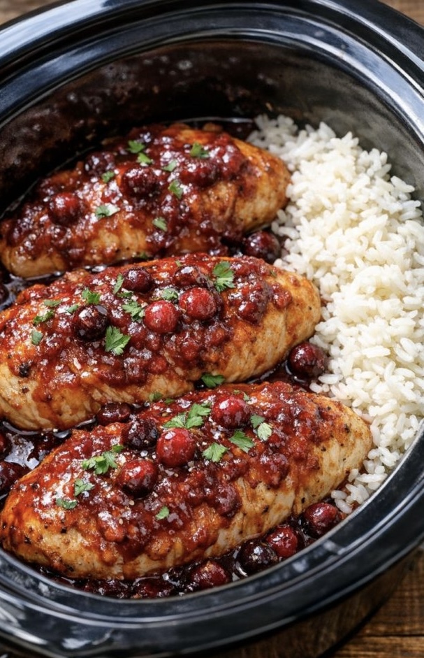 - Coat Chicken: Pour the cranberry sauce mixture evenly over the raw chicken breasts in the slow cooker, making sure all the chicken is coated.