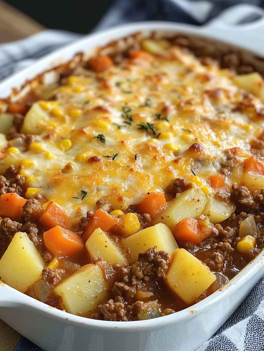 Add potatoes, carrots, celery, corn, diced tomatoes and beef broth. Season with salt, pepper, thyme and rosemary. Simmer for 5 minutes.