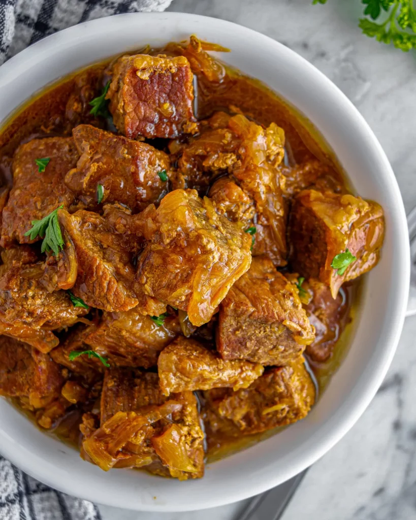 The beef tips come out super tender and juicy, not to mention flavorful. The beef gets fork-tender and makes its own rich, savory gravy.