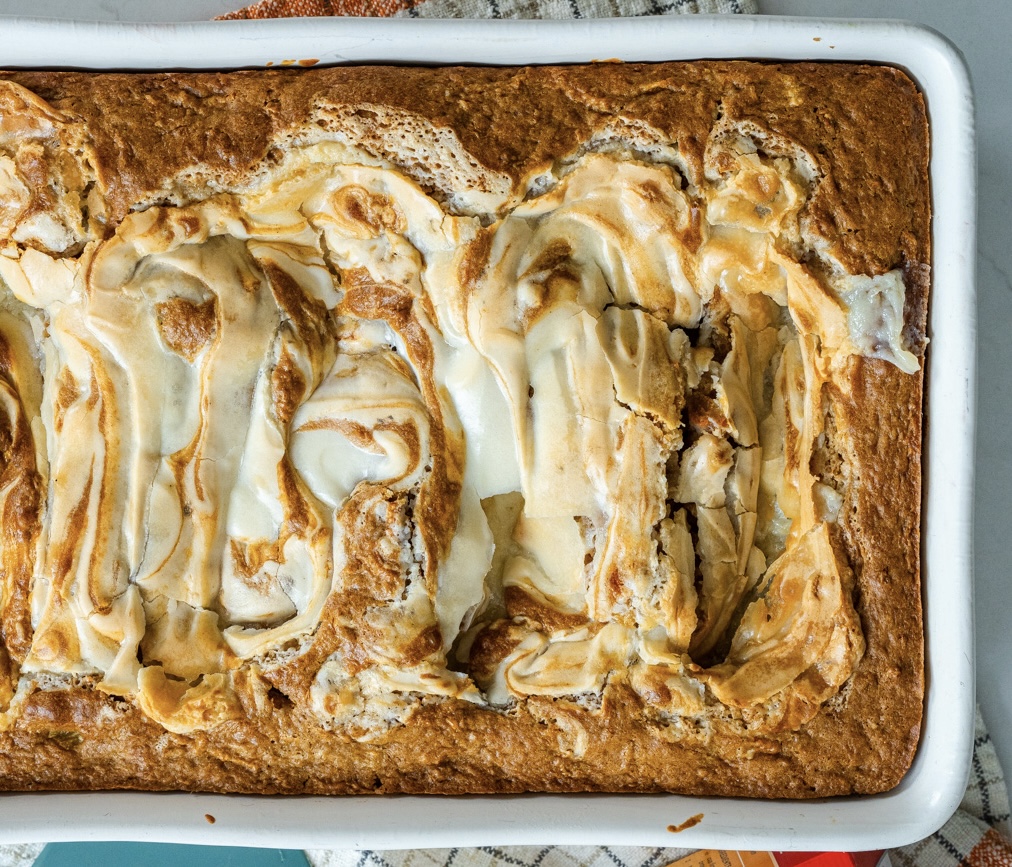 5. Use a knife to gently swirl the cream cheese into the batter, creating the “earthquake” effect (don’t over-swirl).