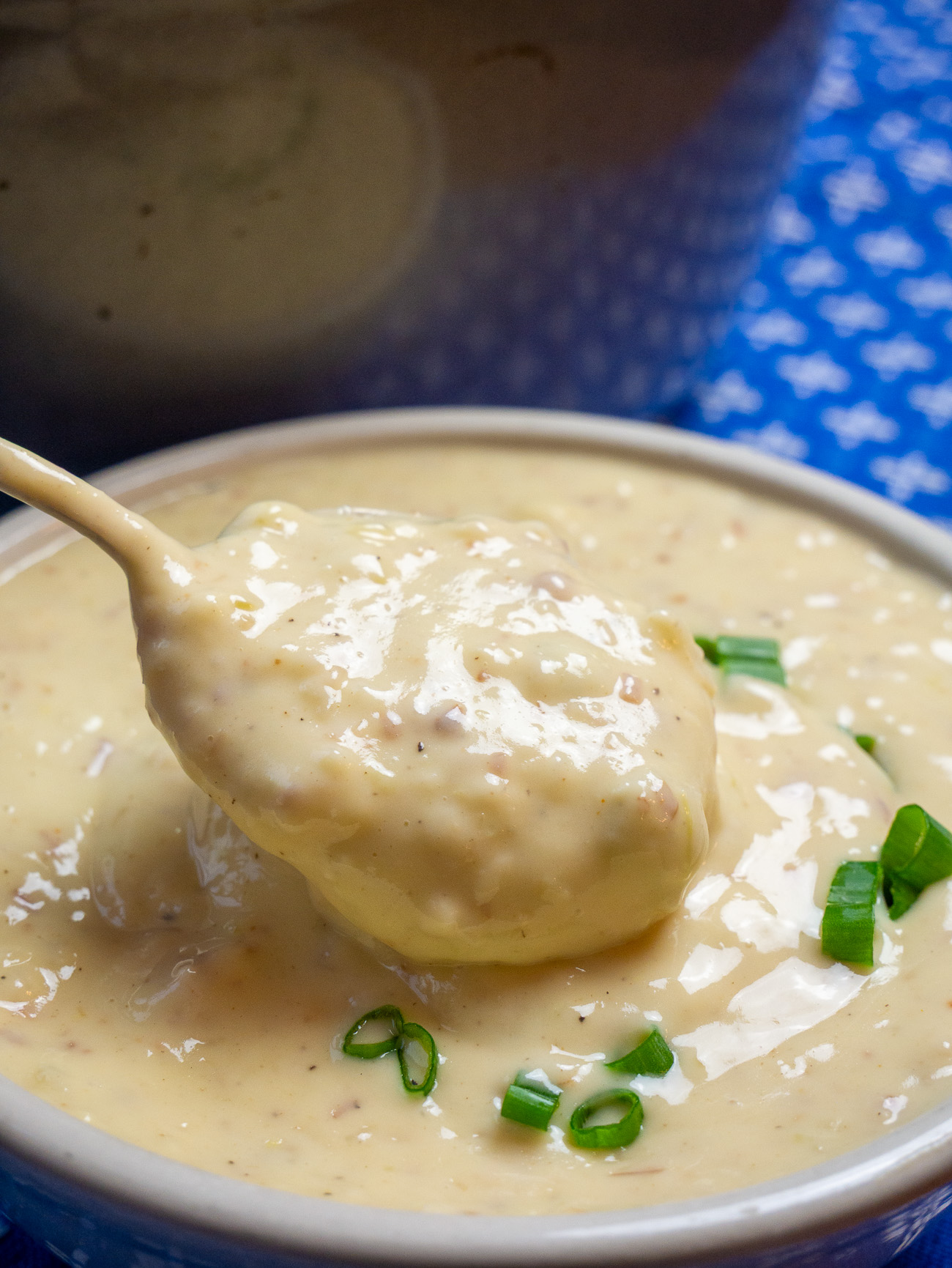 Use an immersion blender to purée the soup until smooth, leaving some bacon pieces if preferred. Stir in the lager, adjust seasoning if needed, and garnish with green onions or chives before serving
