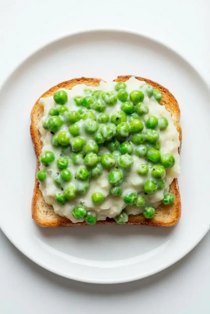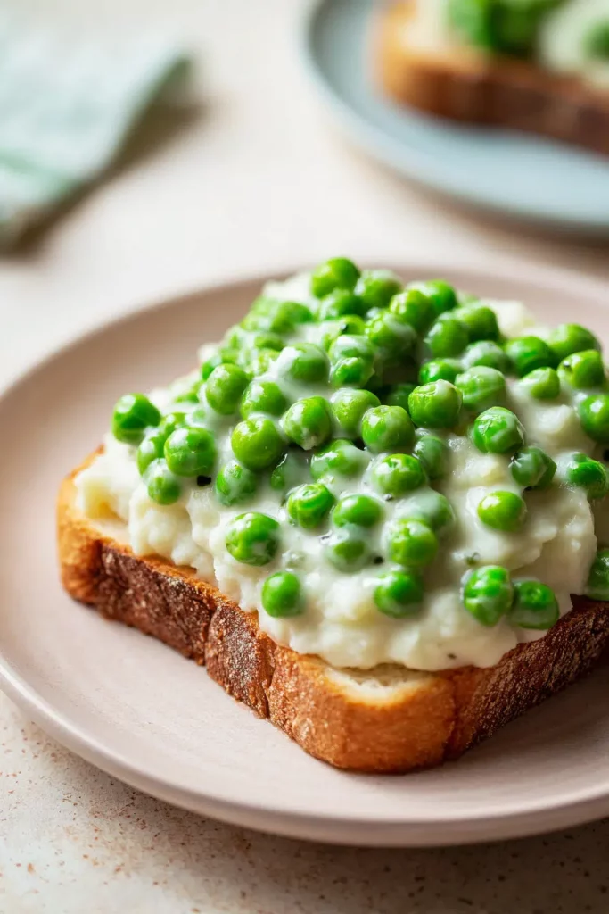 Spoon the creamy peas generously over each toast slice. Garnish with fresh herbs or grated parmesan if desired. Serve immediately while warm.