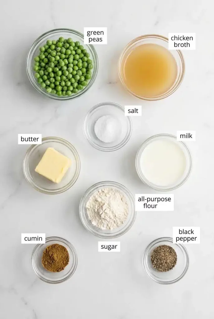 Measure out 1 cup of peas, 2 tablespoons butter, 1 tablespoon flour, and ½ cup milk or cream. Pre-slice your bread so it’s ready for toasting.