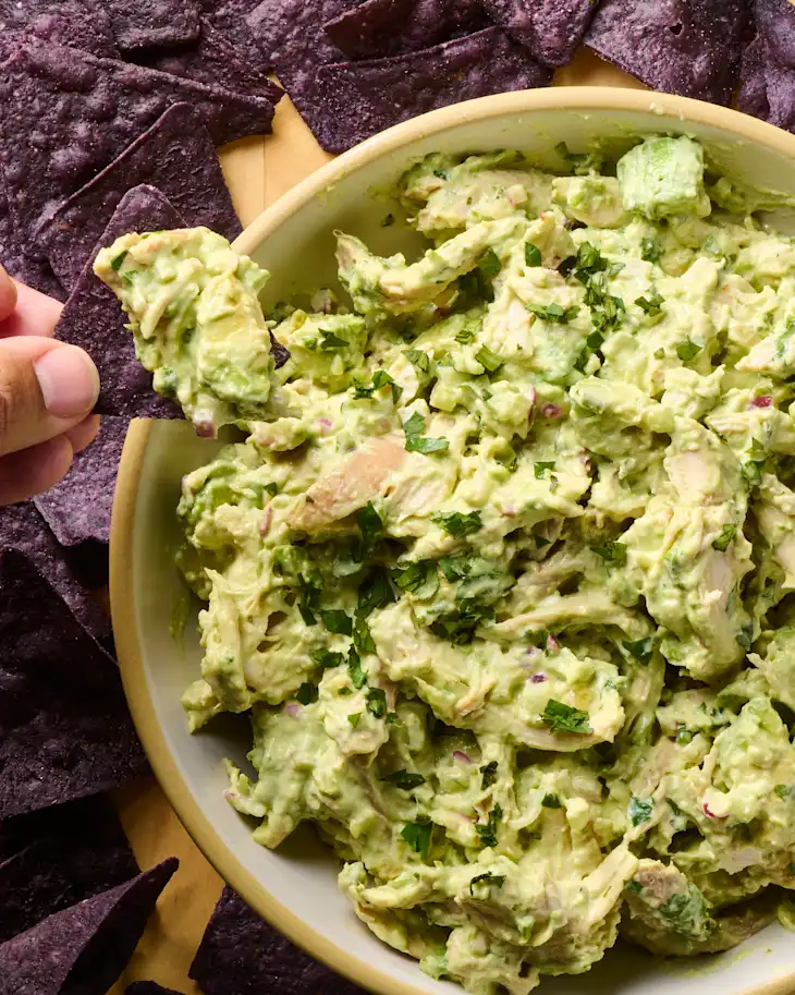 Gently stir in 1 pound shredded, cooked chicken. Cut the remaining 1 avocado into 1/3- to 1/4-inch pieces, then gently fold into the salad. Taste and season with more kosher salt, black pepper, and lime juice as needed.