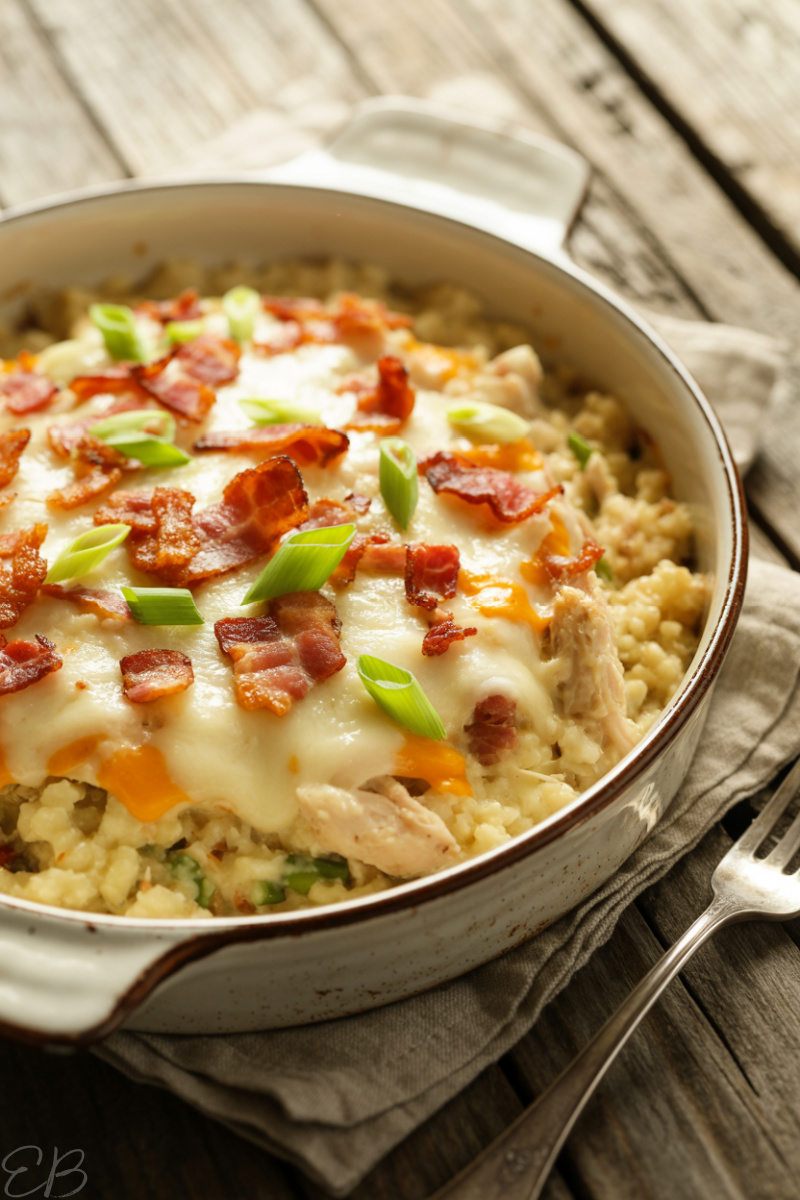 - Combine chicken, bacon, cauliflower, and sauce in a large bowl.