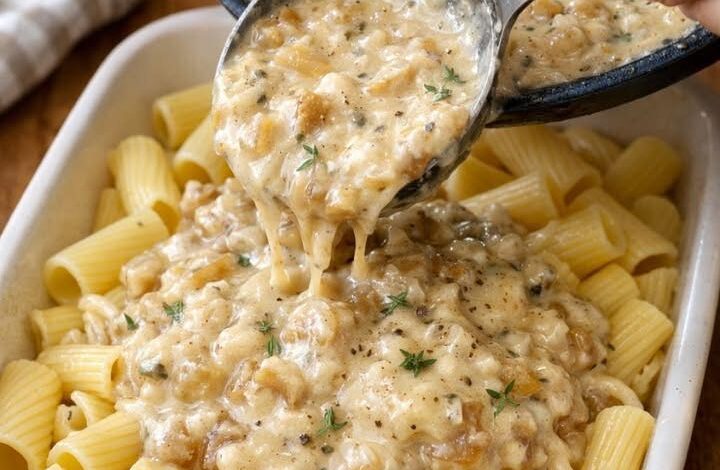 A rich and comforting pasta bake with tender chicken, sautéed mushrooms, and a creamy, cheesy sauce poured over rigatoni—perfect for a cozy dinner.