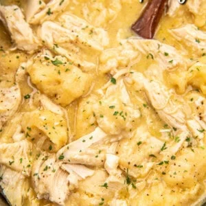 - Remove chicken breasts and slightly shred. Add back into slow cooker and stir (this will break up the dumplings somewhat which is ok). Let cook an additional 10 minutes and serve.