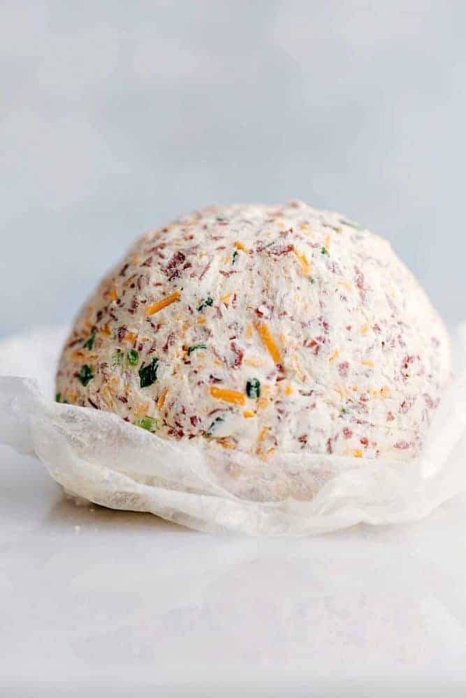 Unroll the cheese ball from the plastic wrap and roll in reserved chipped beef and green onions. Serve with crackers.