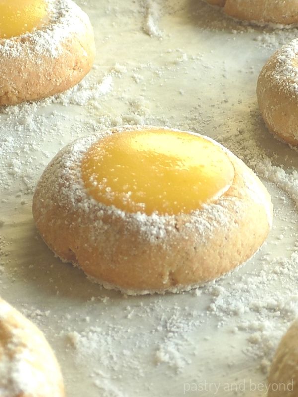 Lemon Thumbprint Cookies are tender, shortbread-style cookies made by hand-no mixer needed-with a mix of flour, cornstarch, two sugars, cold butter, lemon zest, egg yolks, and vanilla. The chilled dough is rolled into balls, coated in granulated sugar, baked until lightly golden, then filled with lemon curd. These buttery cookies have a crisp sugary outside and a soft and tender inside.