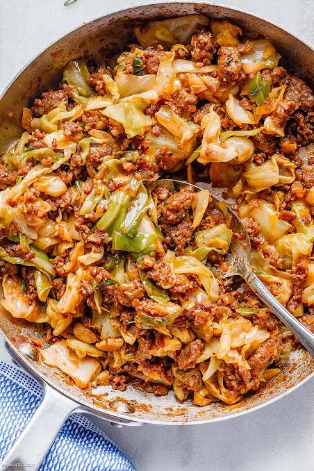 3️⃣ Throw the shredded cabbage into the hot bacon grease and sauté for about 8-10 mins until it’s soft and getting those yummy brown edges.