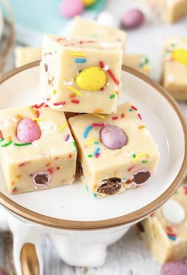 Anyway, what are we doing? Oh…. Easy Easter Fudge!! WOO! I thought of this little creation at 3:30am the other morning when I was busy not-sleeping and instead feeling myself slowly succumbing to one of my daughter’s colds. You can cram a lot of random thoughts in during those early morning hours, and thanks to it, I am all stocked up on Easter Fudge, wahoo! It’s a fair trade-off I’d say.