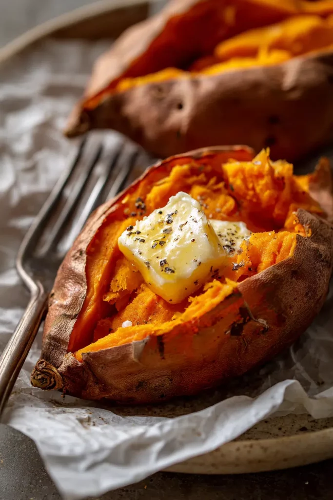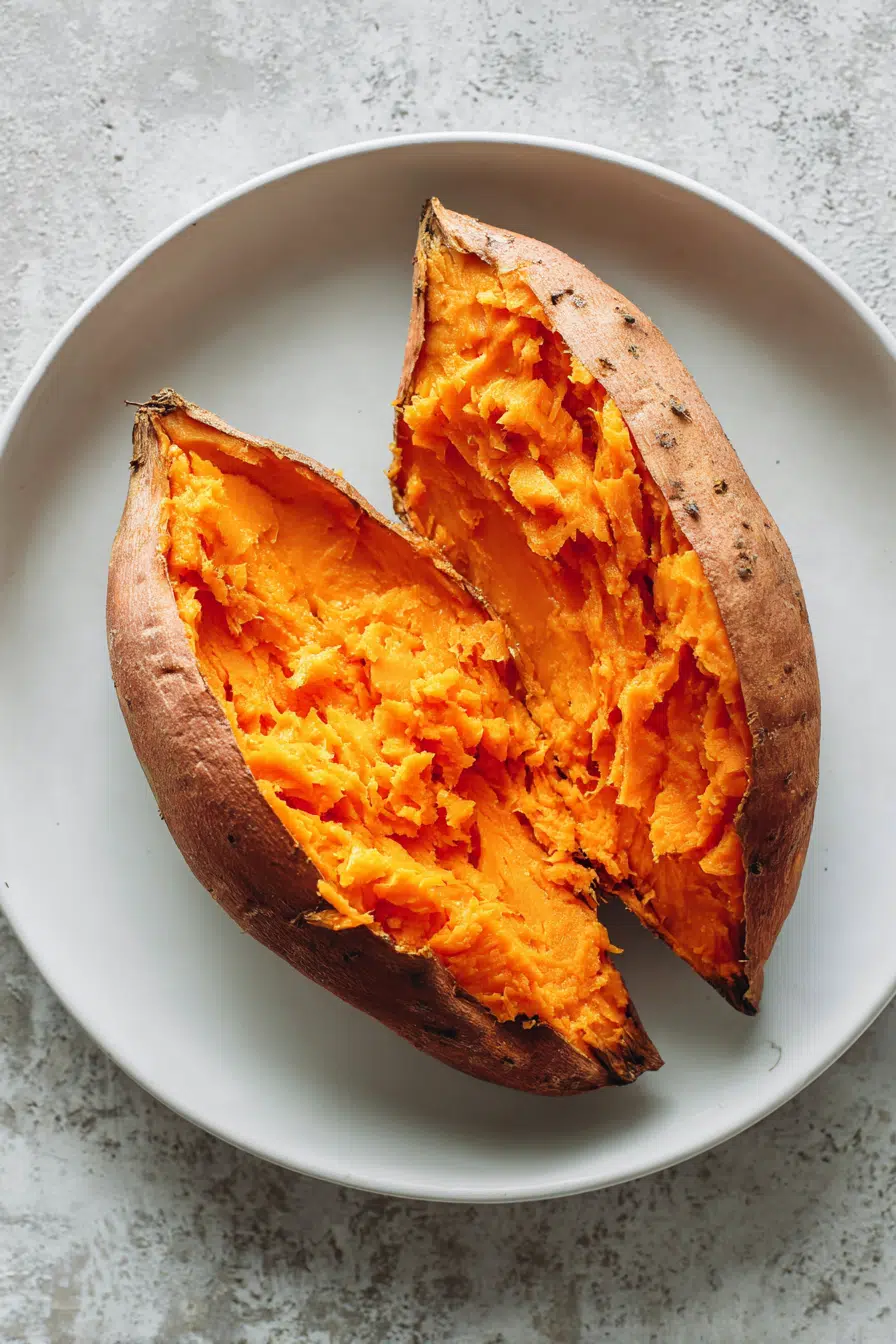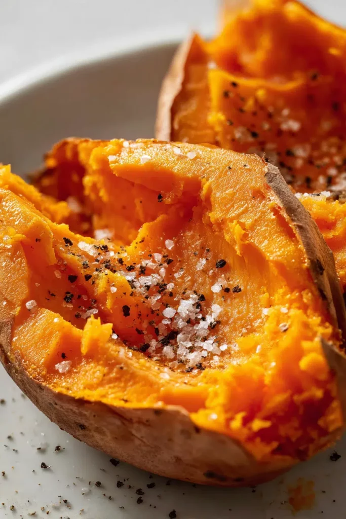 Let the sweet potato rest for 1–2 minutes. Slice it open lengthwise and gently fluff the inside with a fork.