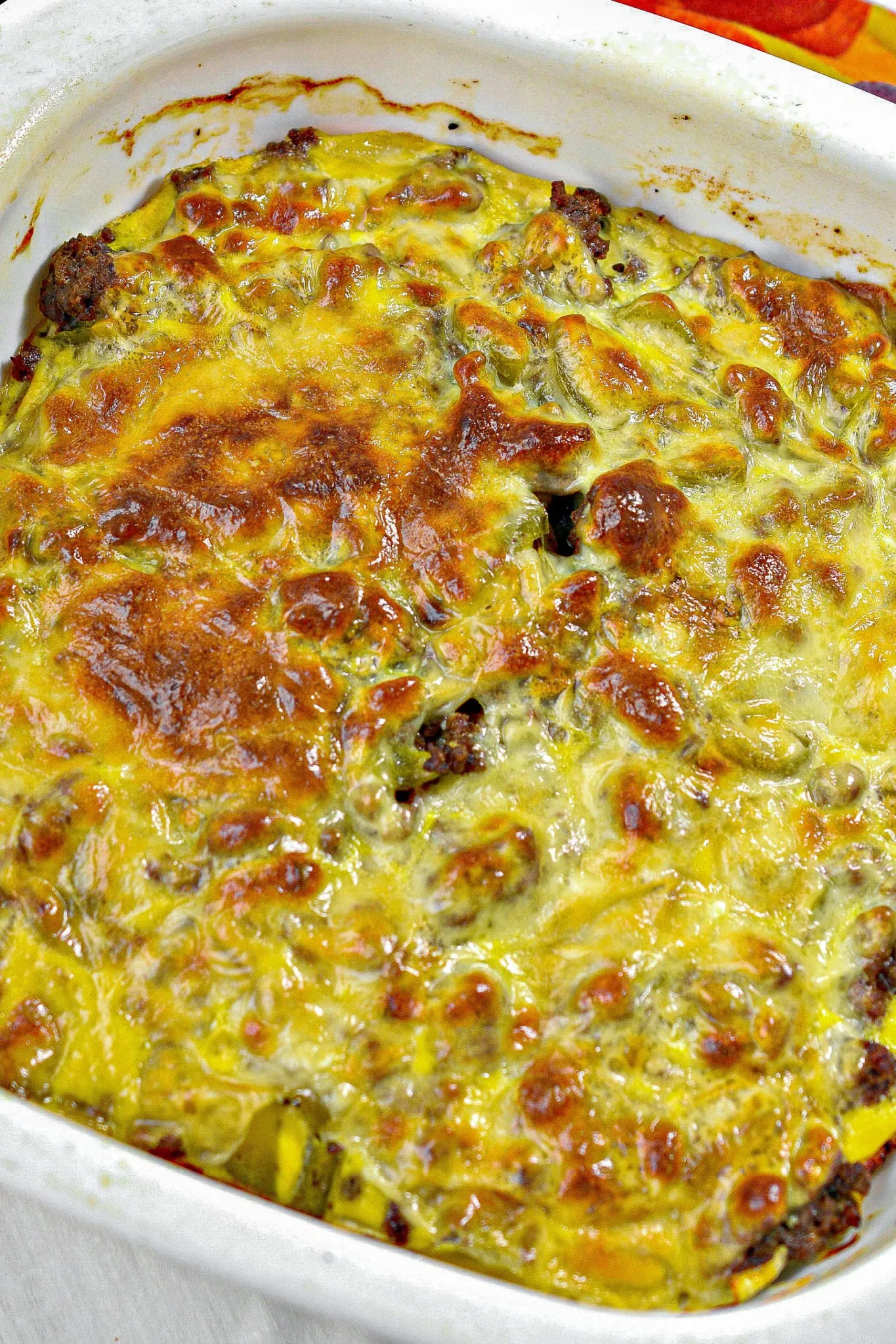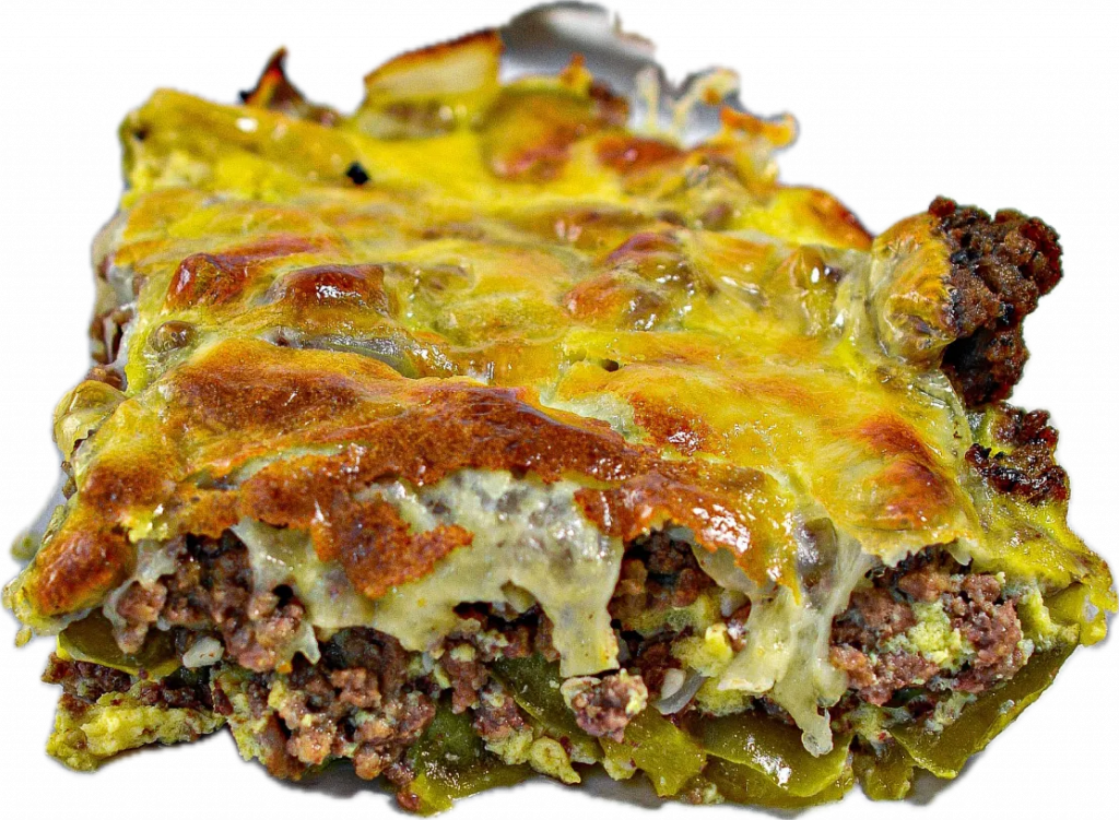 - Layer the beef in the bottom of a well greased 9×9 baking dish.