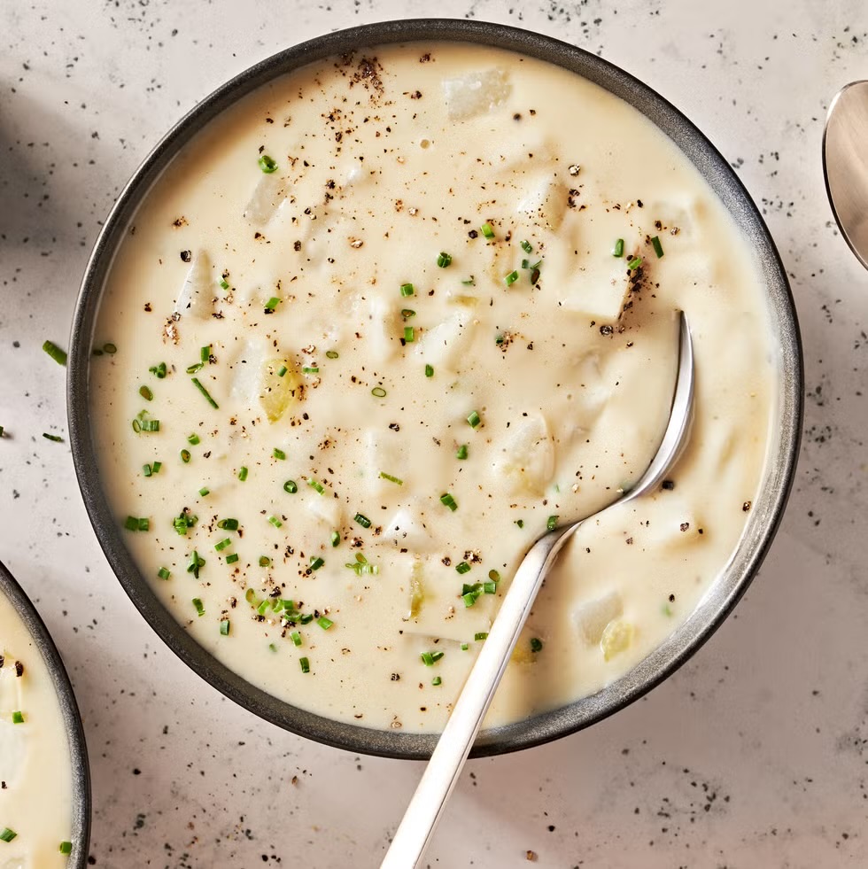Step 2Reduce heat to medium-low. Using a ladle, transfer about 4 c. potato mixture and broth to a blender. Partially cover or vent lid and blend until smooth. Return to pot, stirring to incorporate. Add half-and-half and bring to a simmer. Cook, stirring occasionally to ensure soup isn’t scorching bottom of pot, until slightly thickened, 12 to 15 minutes.