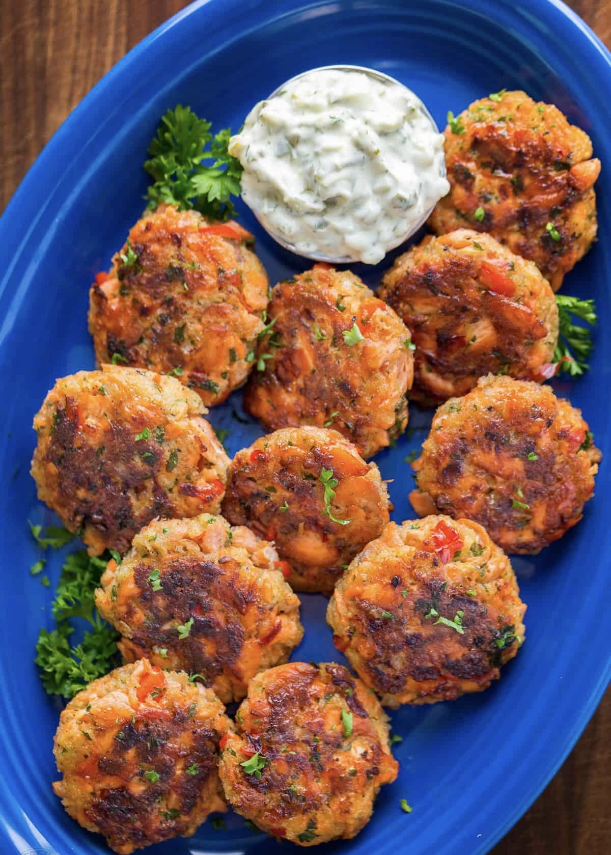 - In a large mixing bowl, combine flaked salmon, sautéed pepper and onion, bread crumbs, beaten eggs, mayonnaise, Worcestershire sauce, garlic salt, black pepper, and chopped parsley. Stir to combine. Form into patties (about a heaping Tablespoonful each) and mold with your hands into 2″ wide by 1/3 to 1/2″ thick patties.*
