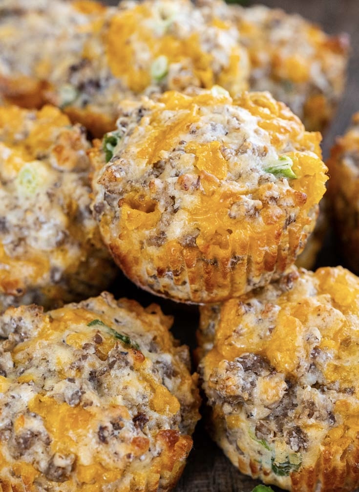 In a medium mixing bowl, stir together eggs (4), shredded cheese (1 cup), green onions (1/4 cup), cooked drained sausage, and baking mix (1 cup). Stir until thoroughly combined.