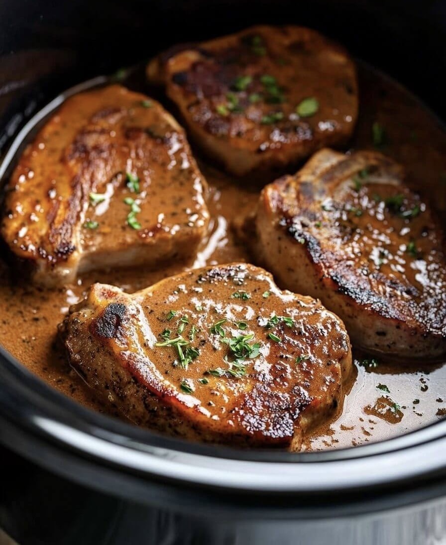 Cover the slow cooker with the lid and cook on LOW for 6 to 8 hours, or on HIGH for 3 to 4 hours, until the pork chops are very tender and the meat is pulling away from the bone. Every slow cooker runs a little differently, so start checking toward the earlier time.