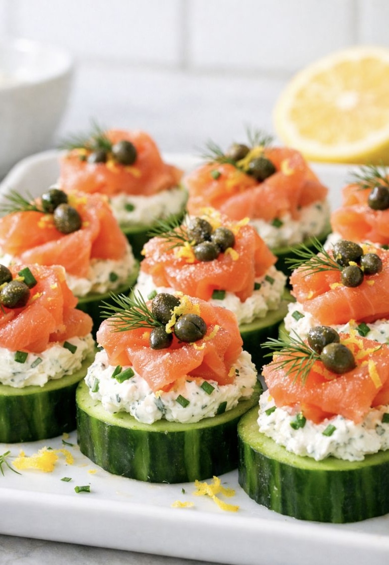 Top with smoked salmon: Take the sliced smoked salmon and cut or tear it into small strips or ribbons that fit comfortably on each cucumber round. Gently drape a piece of salmon over the herbed blend on each round, letting it fold or curl naturally for a bit of height and texture. You don’t need much—just enough to give each bite a clear salmon presence without overwhelming the herbs and lemon.