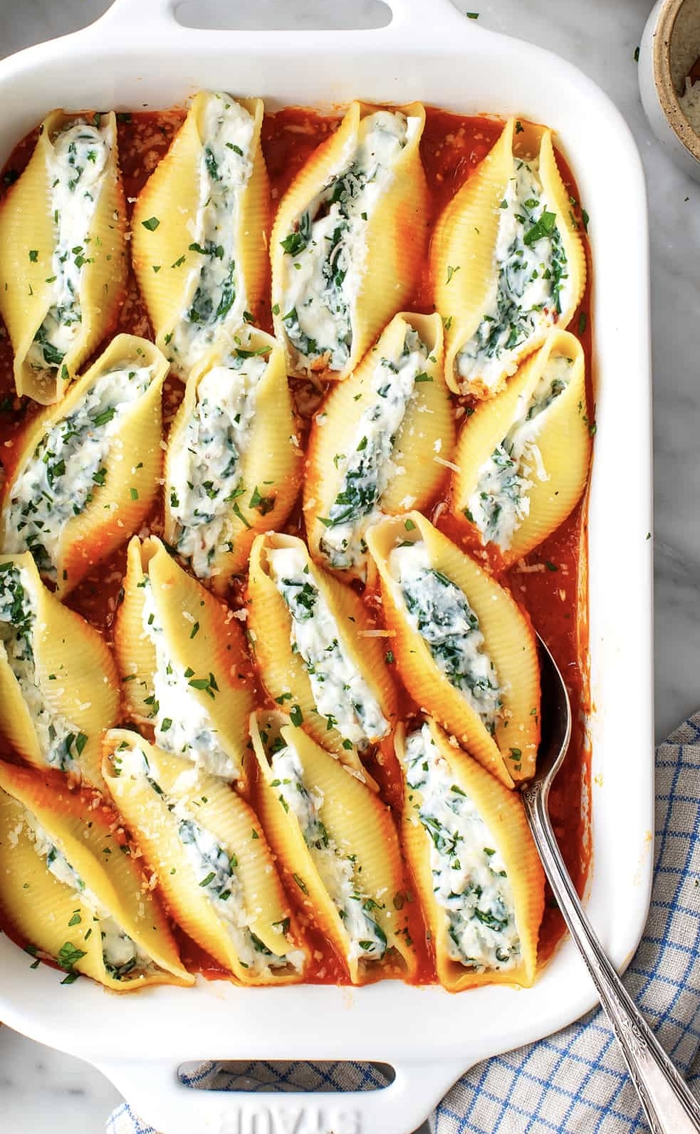 - Spread the marinara in the bottom of a 9×13 baking dish. Stuff each shell with the filling and place in the dish. Cover with foil and bake for 20 minutes. Serve with more marinara on the side.