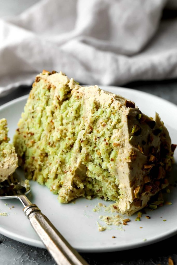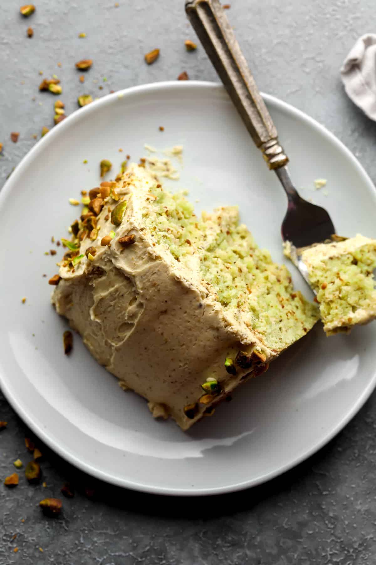 - Real pistachio flavors – Ground pistachios + almond extract are responsible for the delicate nutty flavors in the cake layers, while pistachio butter adds flavor and richness to the vegan buttercream.
