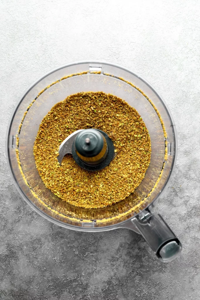 - In a food processor, add the pistachios and process until fine and crumbly, but don’t let it get pasty like pistachio butter!