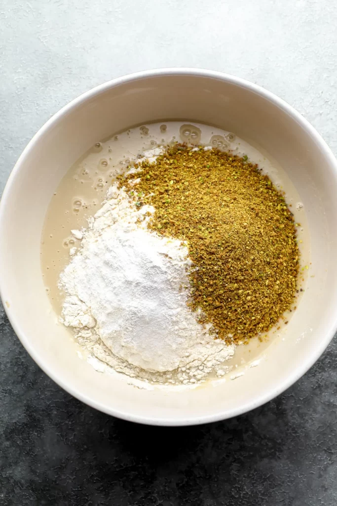 Add the pistachio crumbs, cake flour, baking powder, and salt to the bowl with the wet ingredients. Stir until just combined. If desired, mix in a few drops of green food coloring.