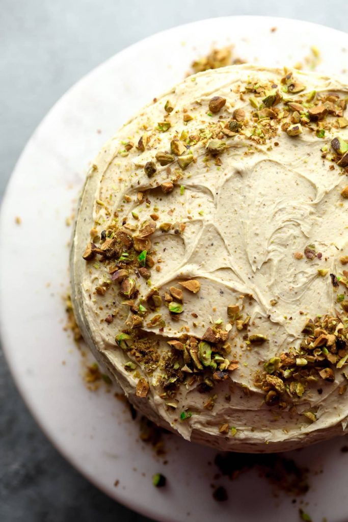 - Place one cake layer on a cake stand and frost, followed by the next two layers. Finally, frost the top and sides of the cake and decorate, as desired with chopped pistachios.