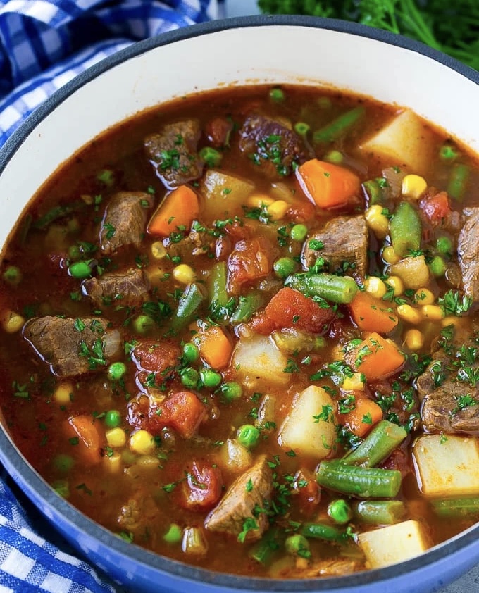 - Stir in green beans and simmer 15 minutes longer, or until all of the veggies and beef are tender.