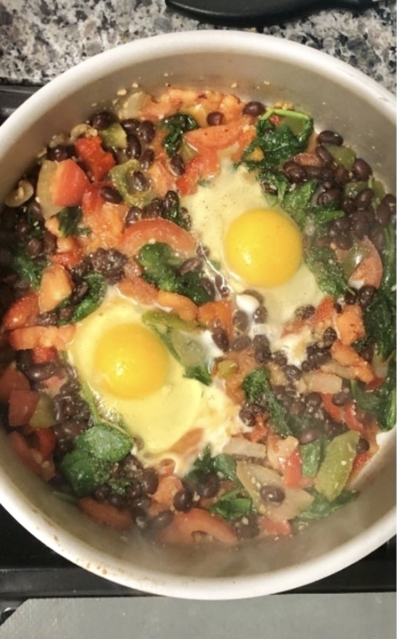 - I just mice garlic and chop up onion and peppers spray cooking spray and heat up the veggie mixture in the skillet. I Added a 1/2 cup serving of canned black beans. Cut up a Roma tomato and add it. A couple handfuls of fresh (or frozen ) spinach.