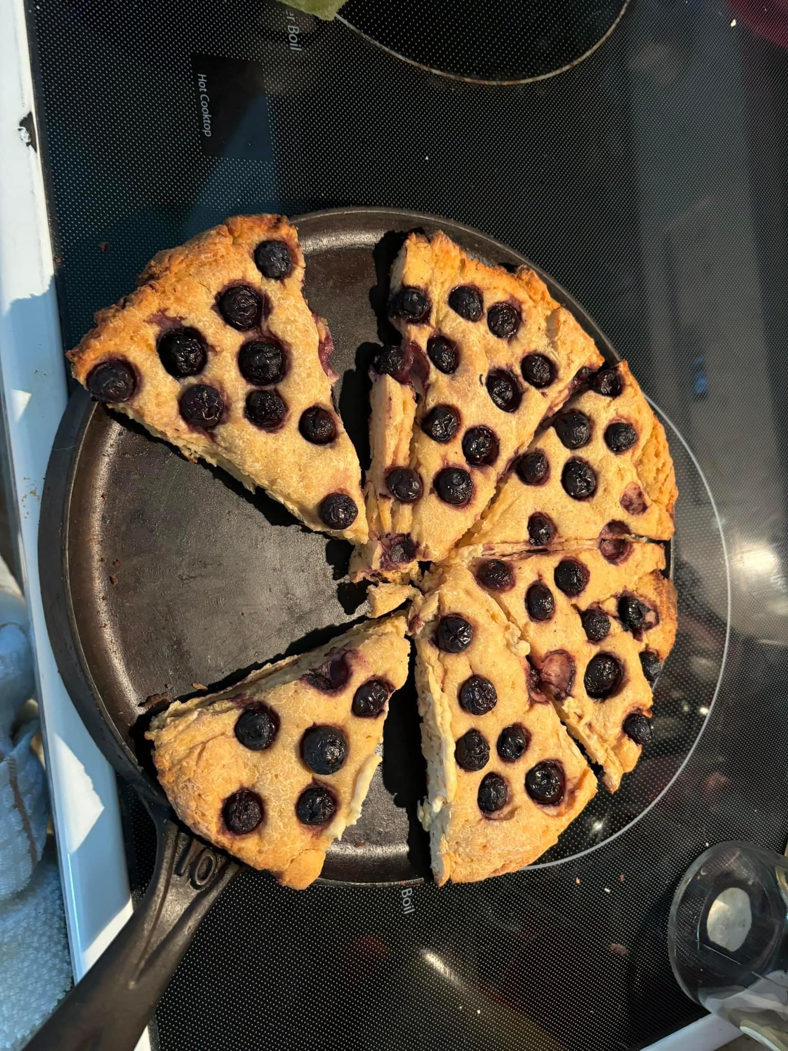 - I patted out the dough on my butter sprayed vintage cast iron griddle , sprayed the top, and dotted with frozen blueberries.