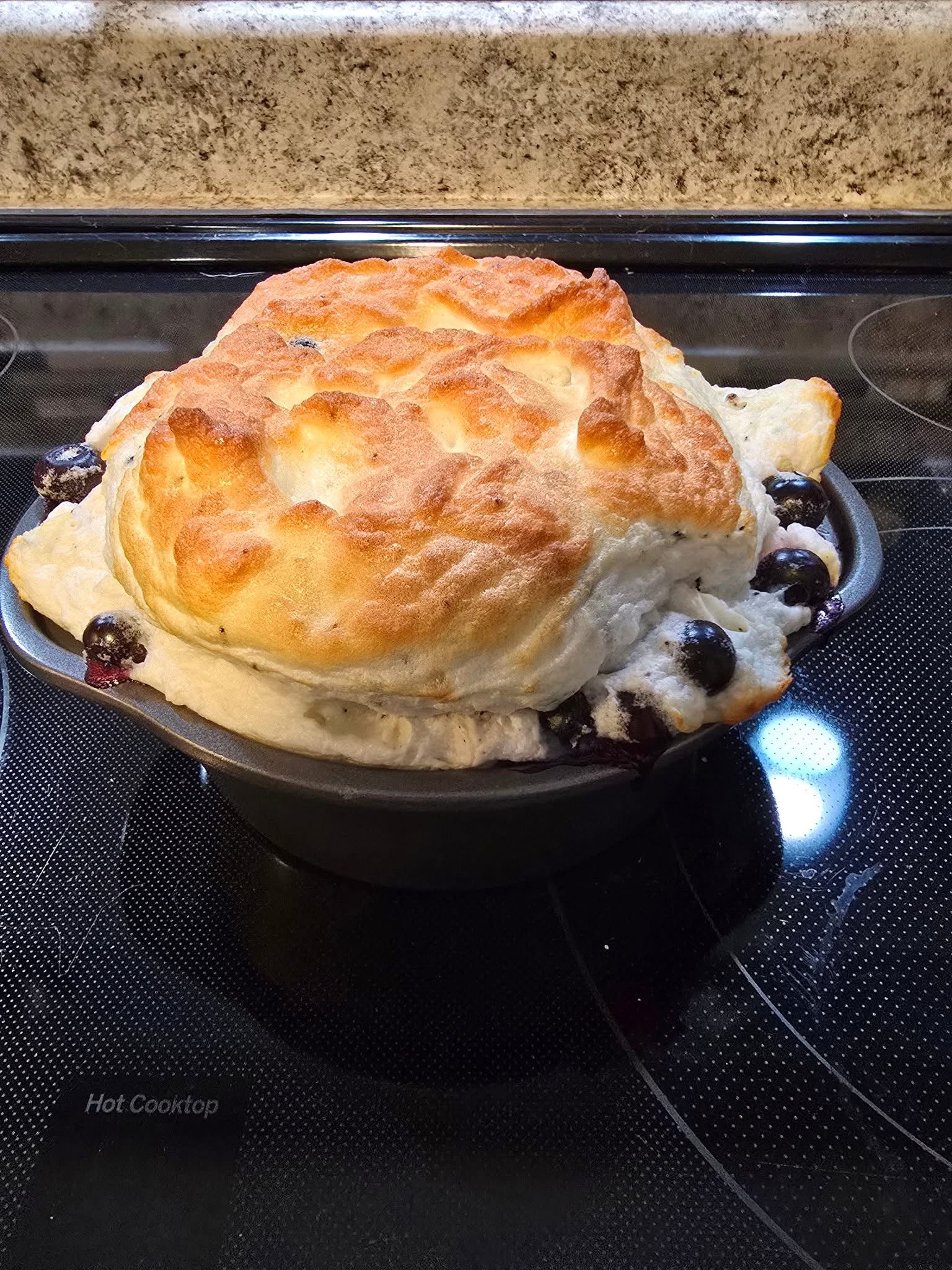 - Once it formed stiff peaks, I folded in 30 grams of Blueberry Muffin protein powder and added that to a 6 inch round cake pan, and tossed in a handful of fresh blueberries. I baked at 400⁰ for 10 mins and it was SO good.
