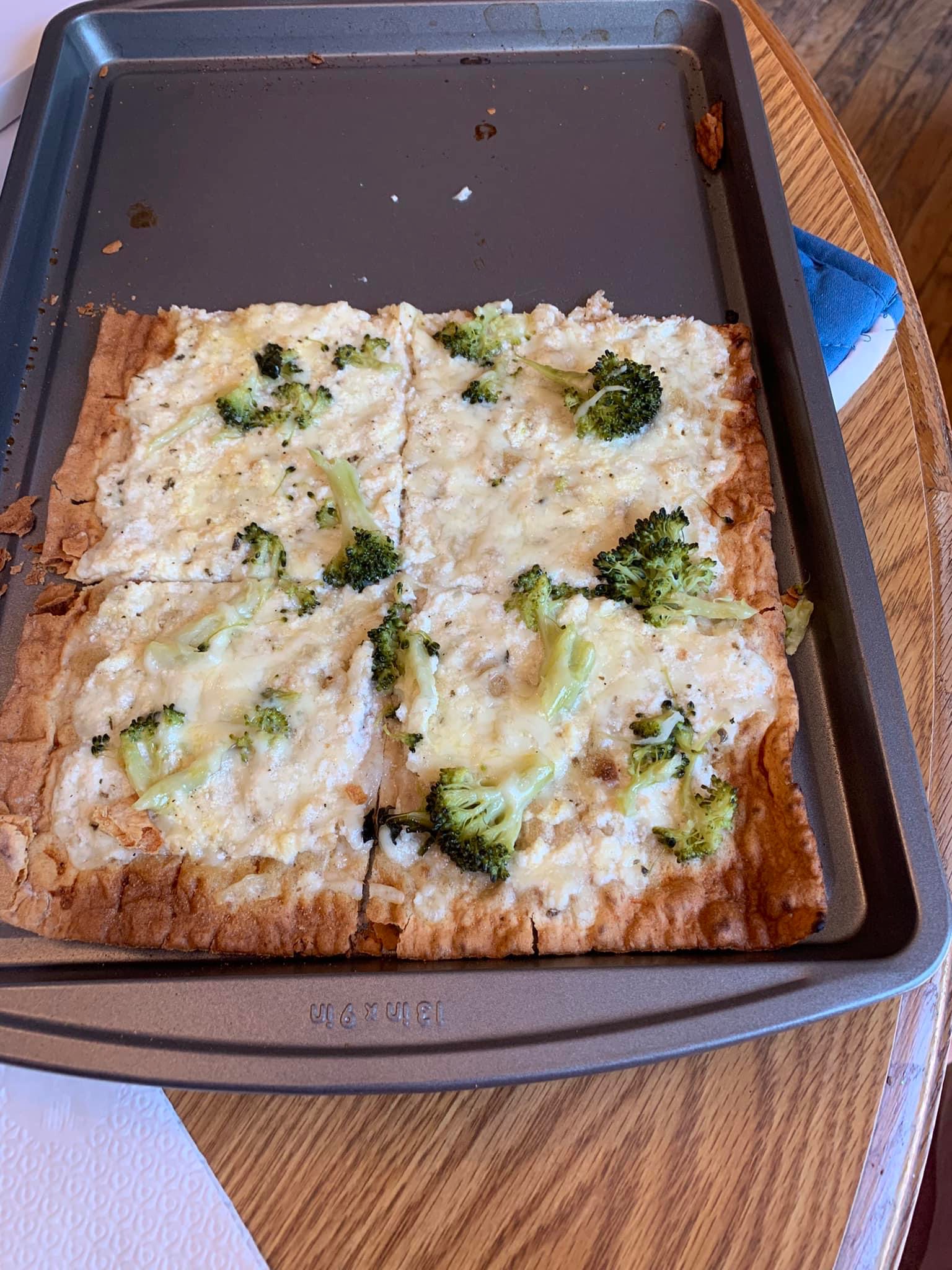 Then I mixed 1/4 cup ricotta and 1/4 cup fat free mozzarella seasoned to my taste and spread it on the entire bread then added the broccoli