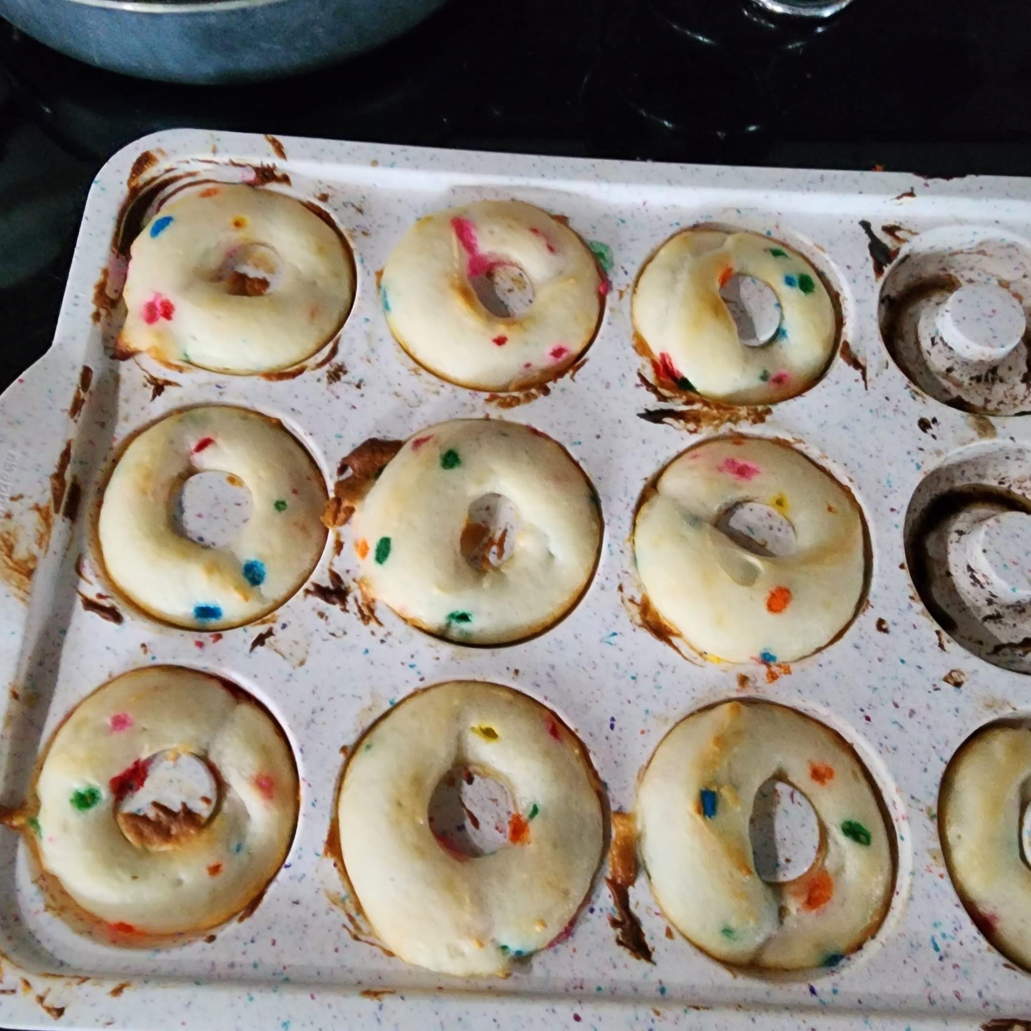2 pipe into a silicone doughnut baking sheet bake 350 degrees for 15-20 minutes.