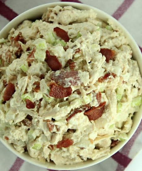 Use your favorite brand and type of bacon. It’s fine to use turkey bacon if you don’t like pork bacon. Once you’ve selected the brand and type of bacon, cook it, drain it, and then crumble into pieces or chop it into small pieces that you can add into the mixing bowl with the shredded chicken, mayo, celery, and more. You dont have to add it but I love it!