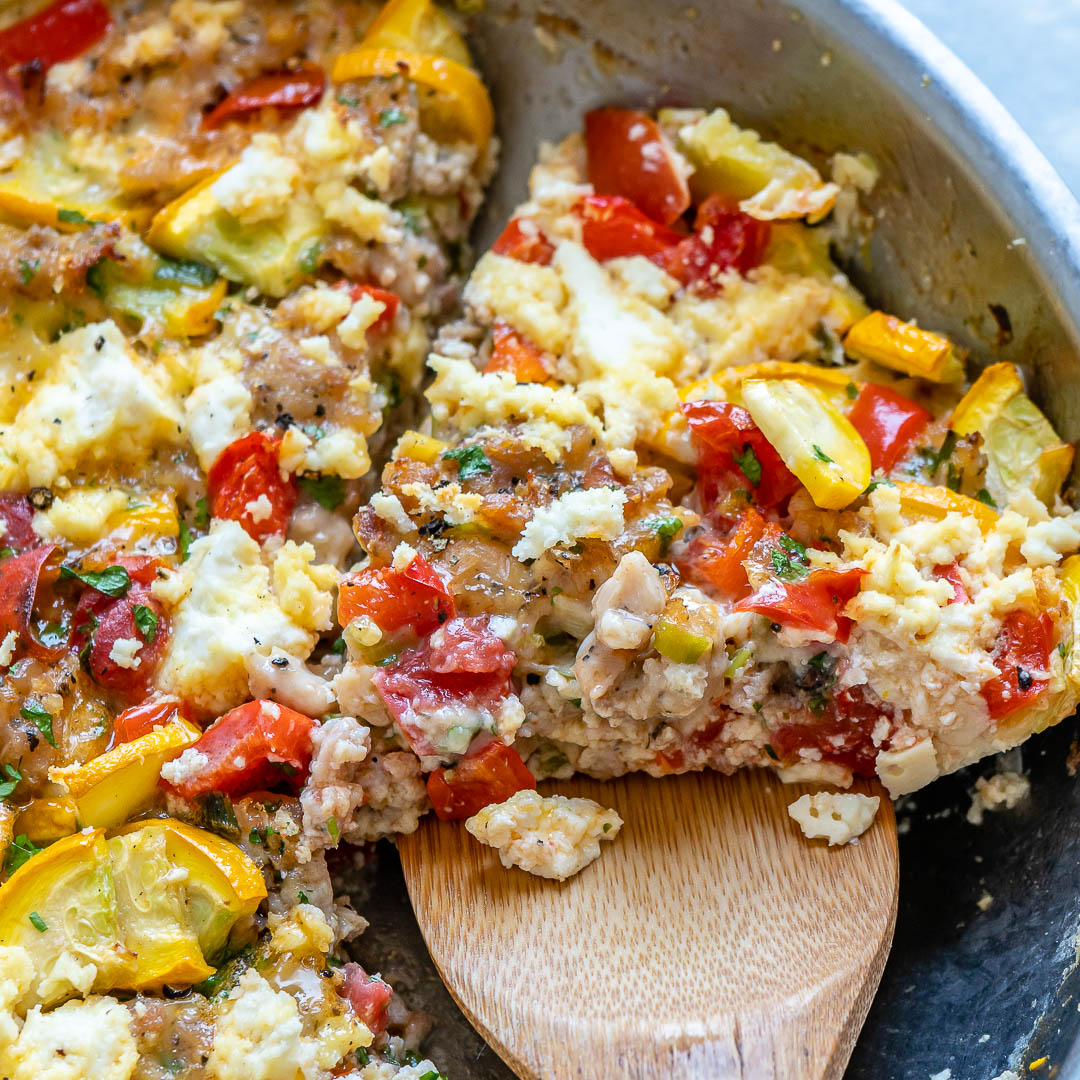 Return the cooked sausage into your skillet and gently stir to combine with the veggies. Gently pour in your beaten egg mixture.